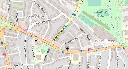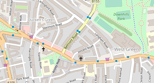 “Part of the main connection” seems to mean “a rat run we use for overflow”. On Map 2, below, St Martins is the yellow patch down a long driveway off of Blake Road, just by the railway. The main connection between the A109 (Bounds Green Road) and Albert Road (B106) should be made by turning onto Durnsford Road (also B106) at Bounds Green. If that route is so busy that Google is sending drivers down Blake Road, perhaps Haringey should get behind the Enfield Council’s proposal to put a bus filter (i.e., no motors except buses) on Durnsford, between Bounds Green underground and the North Circular. I hear, though, that Haringey’s Highways Department actually opposes Enfield’s plan; I can only hope that I am misinformed.